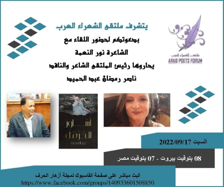 كتبت غادة الحسيني من بيروت / يستضيف ملتقى الشعراء العرب الشاعرة السورية: نور النعمة وذلك في تمام الساعة السابعة مساء بتوقيت القاهرة الثامنة بتوقيت بيروت السبت 17/9/2022 يحاورها رئيس المتلقى الشاعر: ناصر رمضان عبد الحميد أمينة السر بملتقى الشعراء العرب :غادة الحسيني