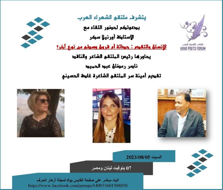 كتبت غادة الحسيني من بيروت : يستضيف ملتقى الشعراء العرب الباحثة اللبنانية / أورنيلا سكر السبت الموافق 5/8/2023 الساعة السابعة مساءاً بتوقيت مصر و لبنان وحوار حول الثقافة والحداثة يحاورها رئيس الملتقى / الشاعر ناصر رمضان عبد الحميد تقديم أمينة سر الملتقى / الشاعرة غادة الحسيني ..