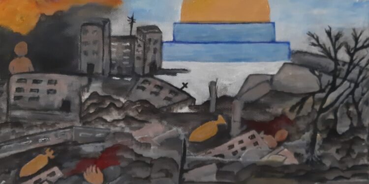 والمساجد الكنائس بالصورة إشارة إلى عدم التفريق في القتل بين الجميع مسلم ومسيحي والدم الذي يملأ المكان في إشارة إلى توقف الحياة والخطر والإنذار قبل فوات الأوان واللّوحة تعبر عن مدى الخراب الذي اصاب الطبيعة والمكان والإنسان، وفهم طبيعة الصراع وأن هذا الكيان الغاصب يريد أن يمحو فلسطين وأن يحوّل المنطقة إلى خراب، إلى دمار لكن، هيهات هيهات له ذلك، إن ما يحدث ما هو إلاّ ثمنًا للحرية.
