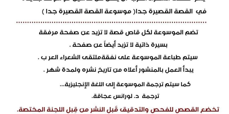 يسر ملتقى الشعراء العرب أن يعلن عن تدشين موسوعة جديدة في القصةالقصيرة