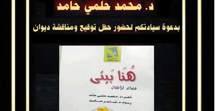 يوم الثلاثاء الموافق ١٤ ديسمبر وفي تمام الساعة الرابعة مساء.. تقام ندوة لمناقشة ديوان الأطفال (هنا بيتى) للشاعر الدكتور :محمد حلمى، بالمركز الدولى للكتاب خلف دار القضاء العالي.. الديوان أحد اصدارات سلسلة سنابل التي تصدرها.. يناقش الديوان الأساتذة: محمد ناصف، جابر بسيونى، آلاء عبد الحميد، صبحي شحاتة.. وسوف يدير الندوة الصديق الشاعر عبده الزراع ، شكرا للصديق للدكتور: هيثم الحاج علي رئيس الهيئة المصرية العامة للكتاب وللصديق الأستاذ أسامة قاسم.. مسؤل الندوات بالمركز.