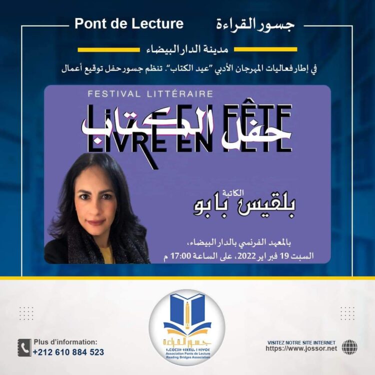 مناقشة و توقيع ديوان ((رقص النوارس )) للشاعرة المغربية :بلقيس بابوبرعاية جمعية * جسور القراءة*السبت 19 فبراير 2022الساعة الخامسة 17:00 بعد الزوال.بالمعهد الفرنسي بالدار البيضاء