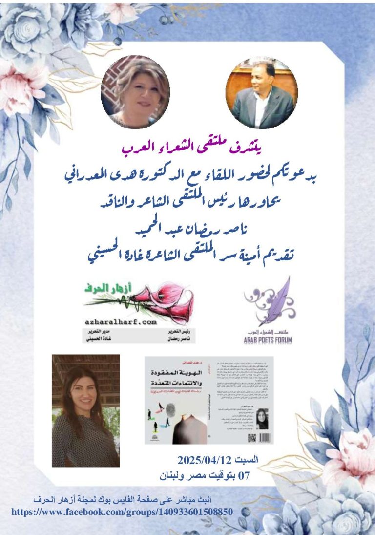 كتبت غادة الحسيني من بيروت يستضيف ملتقى الشعراء العرب الدكتورة اللبنانية هدى المعدراني السبت الموافق12/4/2025 ، في تمام الساعة السابعة مساءً بتوقيت لبنان السادسة بتوقيت القاهرة .ومناقشة كتابهاالهوية المفقودة والانتماءات المتعددةدراسة ثقافية في الخطاب السردييدير الحوار رئيس الملتقى الشاعر /ناصر…