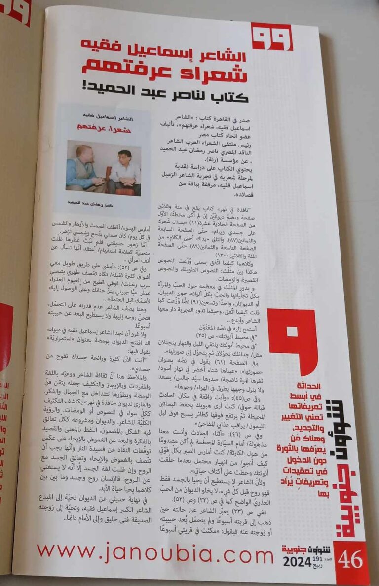 كتبت غادة الحسيني من بيروت صدر حديثا عن دار اسكرايب للنشر والتوزيع بالقاهرة بالتعاون مع ملتقى الشعراء العربديوانسنبلات مضيئة(ومضات)للشاعرة اللبنانية /زينة حمودلوحة الغلاف الفنانة اللبنانية /كارول بشارةتصميم الغلاف الفنانة اللبنانية /ليلى بيز المشغريةزينة حمودعضو بملتقى الشعراء العربومحررة بمجلة أزهار الحرفصدر…