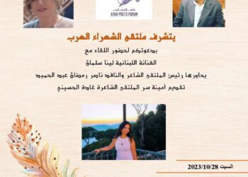 يستضيف ملتقى الشعراء العربالفنانة اللبنانية /لينا سلمانالسبت28/10/2023 الساعة السابعة مساء ًبتوقيت مصر و لبنانيحاورهارئيسالملتقى / الشاعر ناصر رمضان عبد الحميدتقديم ...